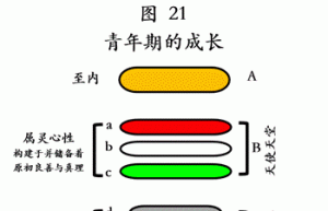 图20展示儿童期心性的成长和储备,婴儿期已于前述,青年期尚未到来。 需将此图与图18、19、21作比较。 儿童期余留的成长和培植主要发生在属灵心性的中层b、属世心性的中层c,以及边缘层的中层e。身体的五种感觉都变得更敏锐和强烈。其余三个未标注的层级,也都有一定的成长,为今后的发展做准备。 层级b是属…