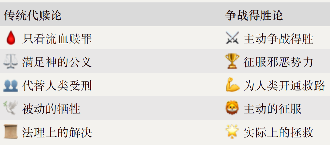 比较传统的“代赎论”与新教义的“争战得胜论” / 列出两种观念的主要差异 / 思考哪种观念更符合圣经的整体启示