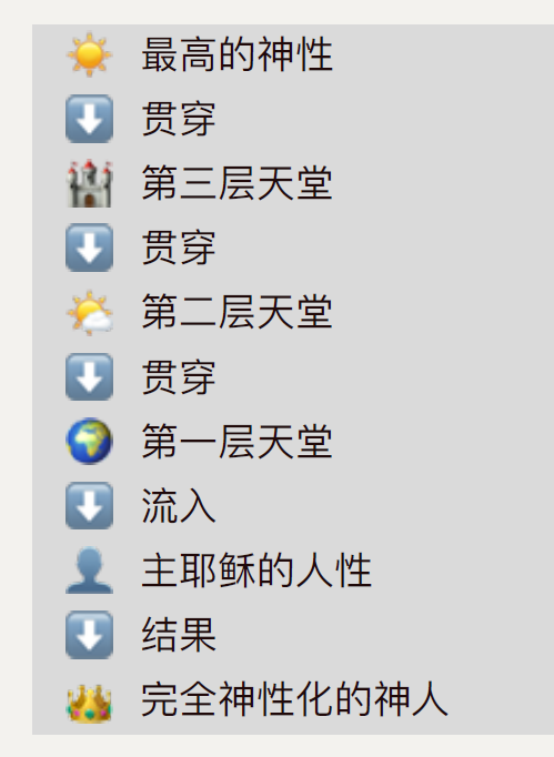最高的神性→贯穿→第三层天堂→贯穿→第二层天堂→贯穿→第一层天堂→流入→主耶稣的人性→结果→完全神性化的神人