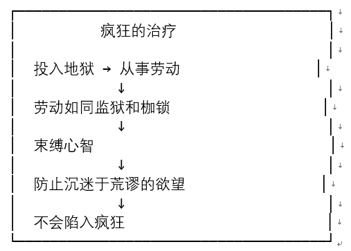 “对于他们的狂乱,唯一的治疗方式是将他们投入地狱,在法官的严格监督下从事劳动。只要他们忙于工作,就不会陷入疯狂;这是因为他们的劳动如同监狱和枷锁一般,紧紧束缚着他们的心智,防止其沉迷于那些荒谬的欲望。”