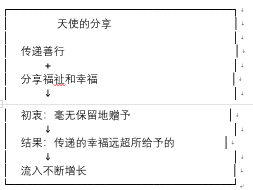 “当天使向他人行善时,他们不仅传递善行,还会将自己的福祉和幸福分享给他人。他们这么做的初衷是将一切美好毫无保留地赠予他人。在这种无私的分享中,他们所传递的幸福和好运远远超过了所给予的,且这种流入不断增长。”